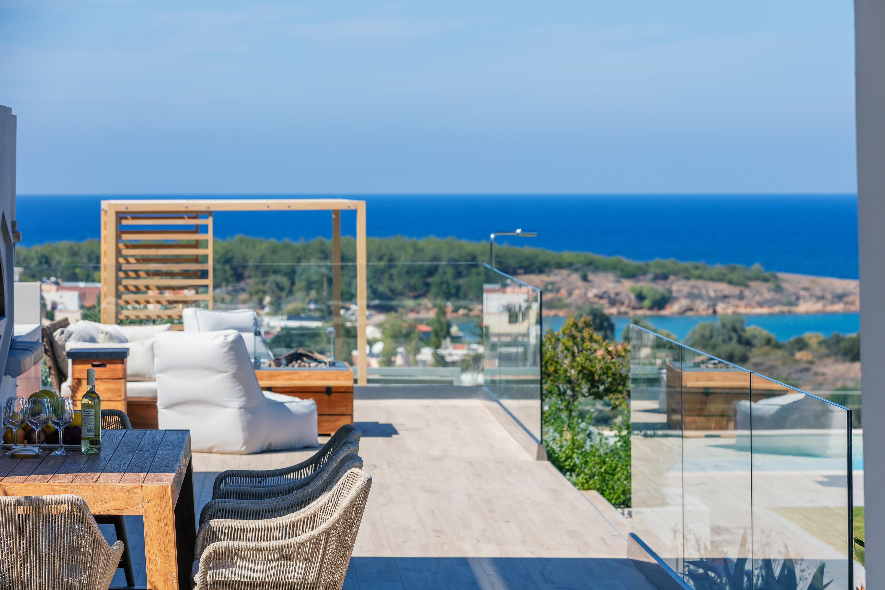 Commanding breathtaking, panoramic views over Chania town and its coastline, the newly built Centro Golden View villa holds a privileged location only a stone’s throw from soft, golden sandy beaches and enchanting Chania town, close to all amenities. This modern, sophisticated villa comprises 3 levels with 6 bedrooms, including a small internal apartment on the lower floor, office workspace, well equipped gym and ping pong table. A large, lawned garden spreads proudly past the patio and barbecue area to the 50m2 swimming pool, all of which looks out to a simply stunning view.